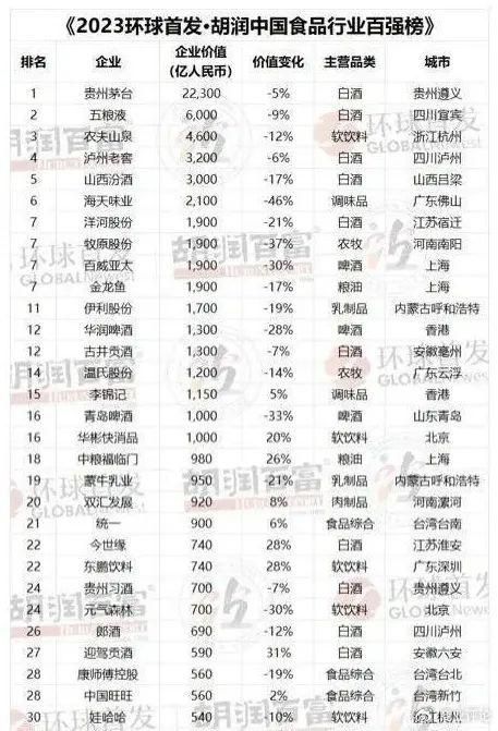 根据今年1月发布的《2023环球首发·胡润中国食品行业百强榜》,农夫山泉以4600亿元的估值位列第三名,钟睒睒也已经连坐了三年中国首富的位置;而娃哈哈仅排名第30位,估值约540亿元,只有农夫山泉的不到12%。