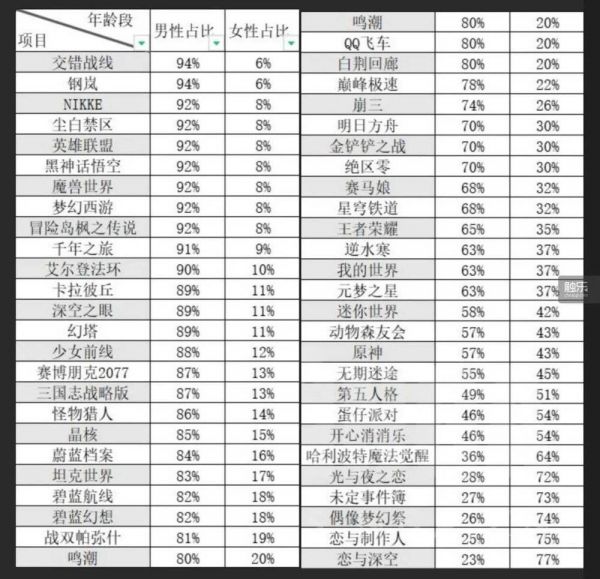 比如,有NGA手综区用户提出,现在从基于百度搜索的TGI(TargetGroupIndex)指数看不同游戏的玩家画像,除了乙女游戏,9成以上的二游(包括一般向)男性玩家占比70%以上,《胜利女神:妮姬》和《交错战线》等传统男性向二游的男性玩家占比超过90%。但在各大平台、尤其是泛传播媒体内,男女玩家的诉求呼声似乎相当。虽然该数据只能起一些参考作用,但仍令一些男性玩家表示,女性玩家在舆论上的热度反向促成了“有男不玩”的局面。
