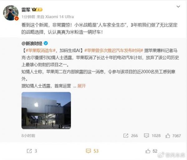 关于苹果公司取消造车一事,雷军发文表示非常震惊,并说小米在三年前做了无比坚定的战略选择,认认真真为米粉造一辆好车。