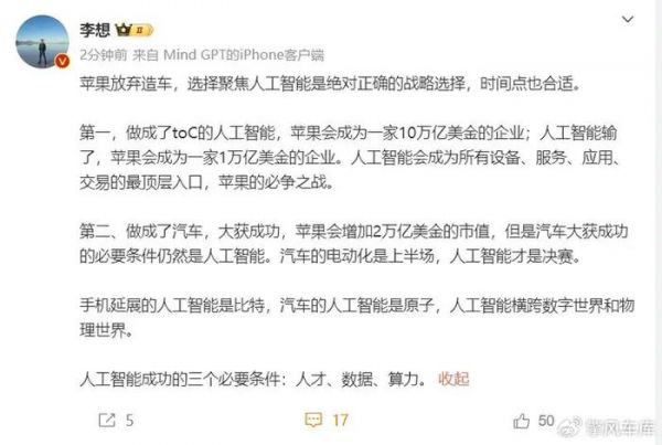 而理想汽车的李想也发文回应了此事,表示苹果公司放弃造车转向AI是绝对正确的战略选择,以后的AI人工智能将会横跨数字世界和物理世界。