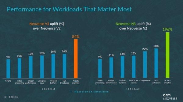 Arm进一步扩展Neoverse CSS,推出了CSS N3和CSS V3。这两款新品则是分别基于新的Neoverse N3和V3核心。N系列在压缩方面取得了性能优势,可降低云服务运营商的成本,并最终降低云服务客户的成本。同样地,V系列显著提高了协议缓冲区的性能,这是在数据中心内传输数据的一项关键功能。