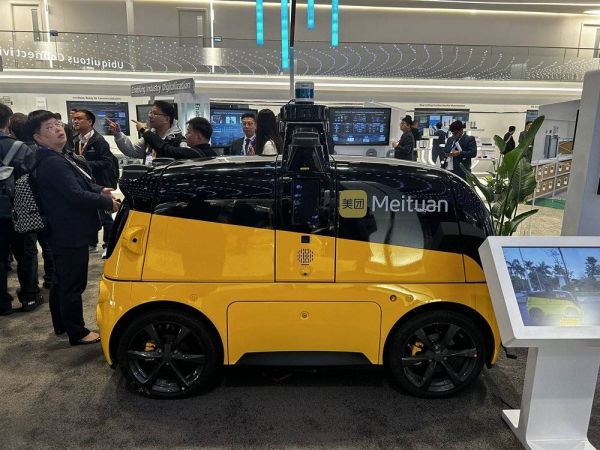 华为展区的美团无人配送车,5.5G 有望将其运行速度提升50%,虎嗅记者现场拍摄