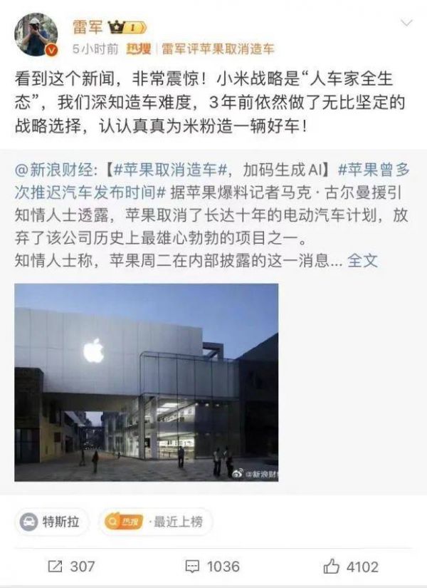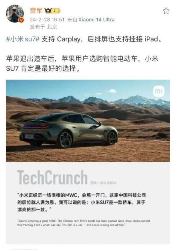 哦对了,雷军还有一条微博是这么说的:“苹果退出造车后,苹果用户选购智能电动车,小米SU7 肯定是最好的选择。”