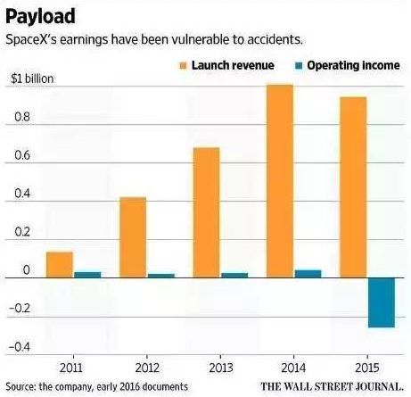 SpaceX即使取得了发射成功,财报看起来也十分不理想。下图深色为运营利润。2015年SpaceX的收入预计为18亿美元,运营利润5500万美元,但一出爆炸事故,就损失2.6亿美元,前几年赚的还不够这次赔的。
