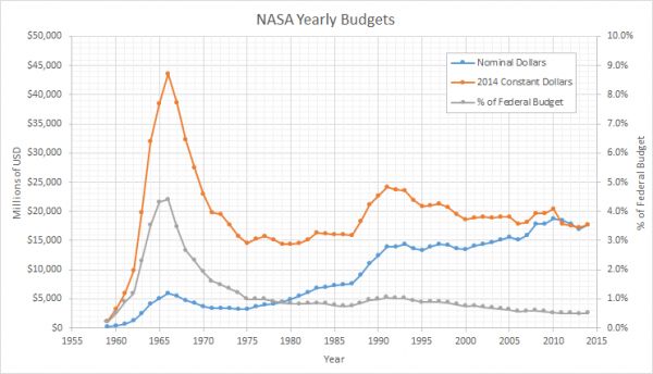 先看预算,1962年9月肯尼迪在莱斯大学发表《我们选择登月》后,登月10年间,NASA占联邦预算飙升,一度上升到了4%以上,达200亿美元(换算为2014年币值为450亿美元),阿波罗飞行器和土星运载火箭总共花费了830亿美元(换算为2005年币值)。