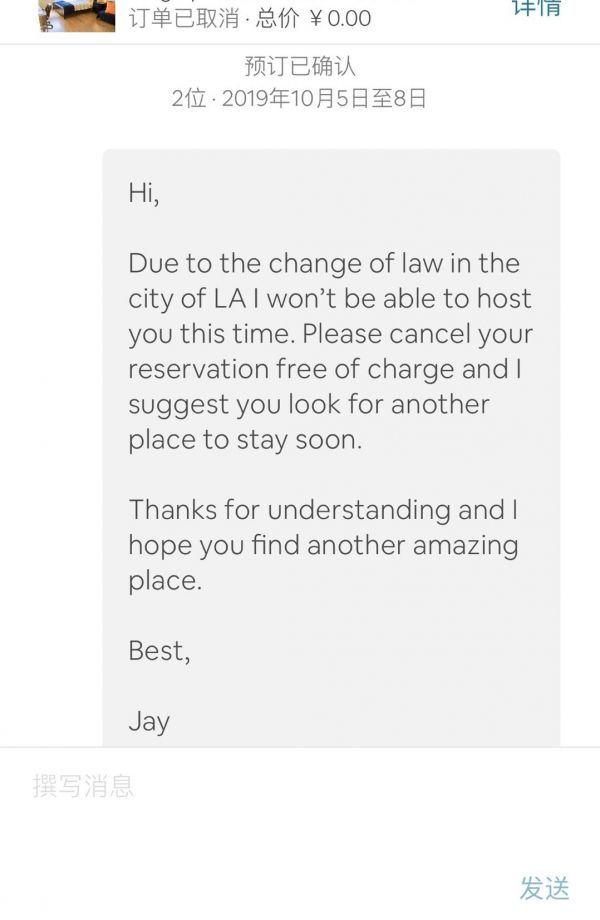 今年国庆黄金周期间,澎湃新闻(www.thepaper.cn)分别通过爱彼迎平台预订了美国洛杉矶的两处住所与美国纽约的一处住所,临行前,其中一处位于洛杉矶房源的房东发来消息,称由于洛杉矶的法律更改问题,其无法向我们提供房源,因此希望我们取消预订,寻找其他住所。