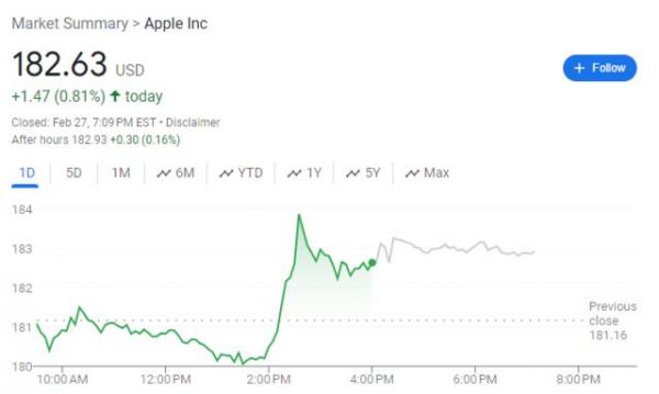 消息传出后,周二美股午盘时段,苹果股价持续反弹,午盘转涨后曾涨超1.5%,收涨约0.8%。