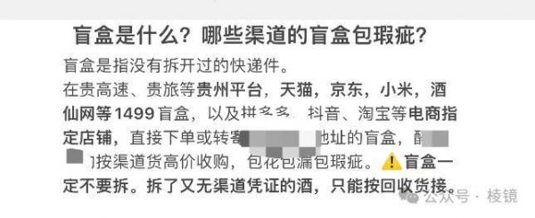 与作者交流的 7 名酒商中,大多没有接触过百亿补贴的货源,仅有两位长期做白酒流通渠道、且规模相对较大的酒商会持续回收,但是明确要求:消费者收到酒之后不要拆开快递,只需要连包装一起转手即可。这些没有拆封过的货源在业内被称为 " 盲盒 "。