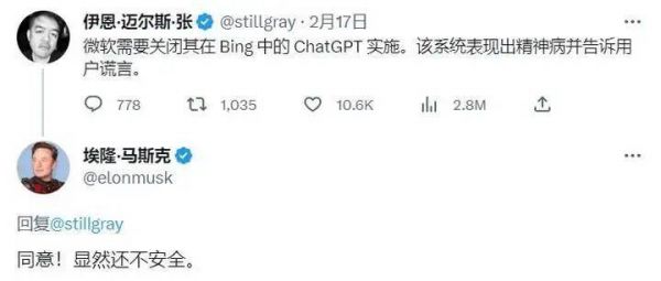 马斯克却表现出了足够的谨慎。当网友评论“微软需要关闭新 Bing”时,马斯克附议,称“显然现在还不够安全”。
