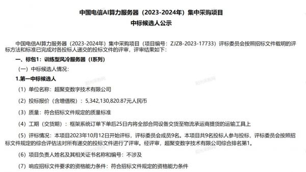2023年10月15日,中国电信AI算力服务器(2023-2024年)集中采购项目公布候选人,总集采金额超84亿元,超聚变、浪潮、中兴等多家入围。从招标文件来看,预估采购规模为4175台。