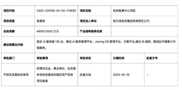 2024年2月18日,哈尔滨平房区发展和改革局批复《哈投智算中心项目》,总投资4.6亿元,预计购买130台AI服务器,建成后开展算力外租服务。而此前哈尔滨数字龙江智算中心项目已经开标,中标金额约2.226亿元。