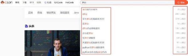 在该网站首页搜索“茅台”,展现出来的相关关键词就有:京东茅台抢购脚本2023、i茅台自动申购脚本、天猫茅台抢购脚本2023、python抢茅台代码等。