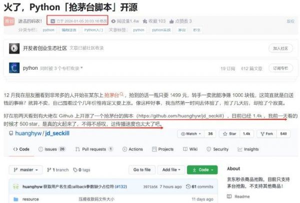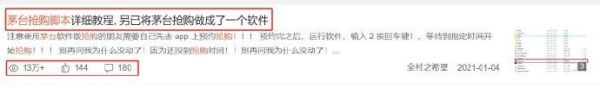 其中,CSDN上的这篇文章《茅台抢购脚本详细教程, 另已将茅台抢购做成了一个软件》,阅读量超过13万,属于社区“爆文”。