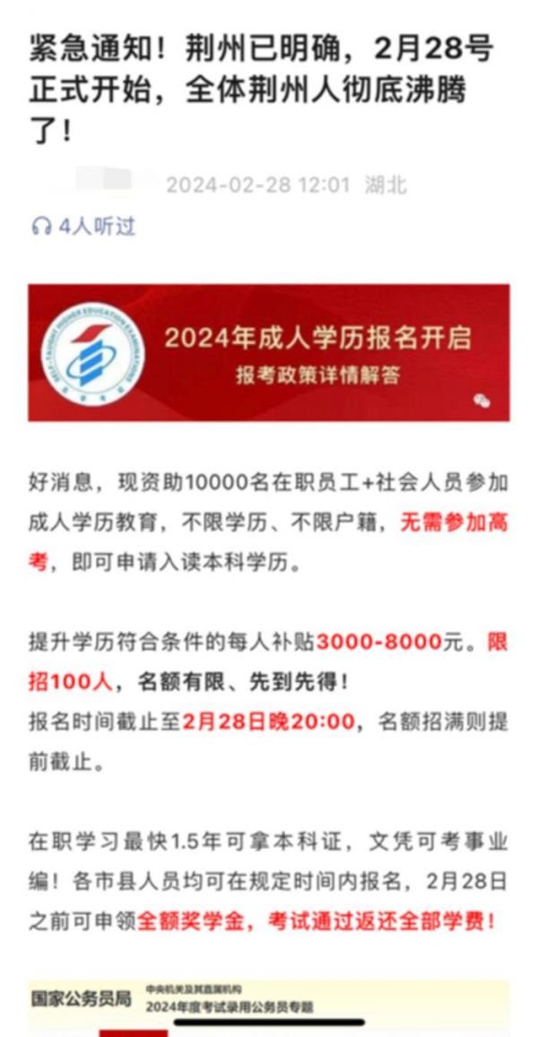 例如,标题宣称“紧急通知”,同时明确指向某地区人群作为目标用户,误导该群体用户以为出台与其相关的政策,而正文实则为商业活动/课程广告。