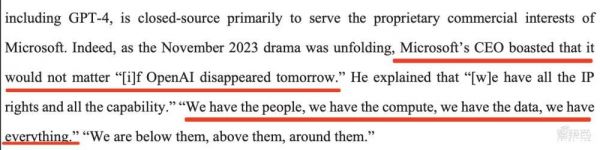 阿尔特曼几乎变相承认了公司技术可以完全转移到微软。诉讼文件指出,阿尔特曼在被解雇后不久的一次采访中说:“我们对自己的能力非常有信心。我们拥有所有的知识产权和所有的能力。如果OpenAI明天消失了,我真的不希望我们的任何客户感到担心,因为我们拥有继续创新的所有权利。不仅仅是为了提供产品,我们还可以继续我们在合作中所做的事情。我们有人才,我们有计算能力,我们有数据,我们拥有一切。”