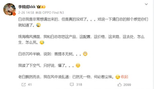 2月26日,李楠连发了三条微博,确认白永祥不会和他一样出现在魅族21 PRO的发布会上。(图/李楠微博)