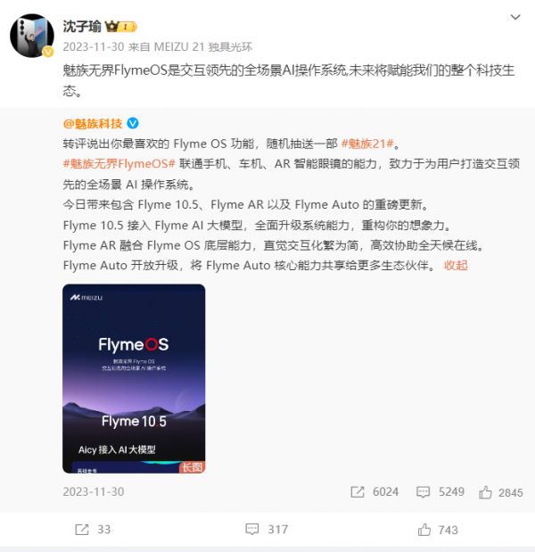 在跨界车机系统之后,AI就是Flyme锚定的方向。(图/沈子瑜微博)