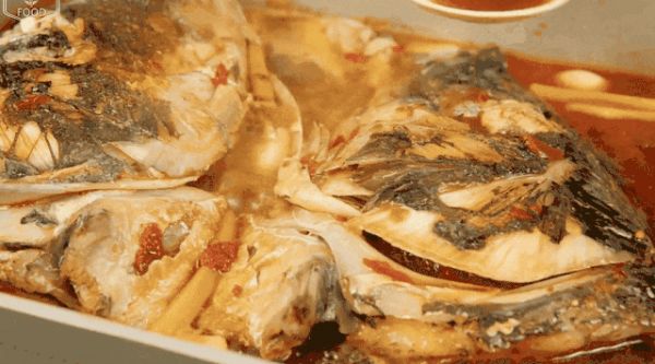 接下来的重头戏就由红烧的汤汁来主演,融合了大葱蒜头干辣椒的香味,混着点五花肉煸出的猪油,还有豆酱辣酱调出来的醇厚。融汇了种种美味的汤汁在小火中把鱼头焖炖入味,自己也变得又浓又稠,紧紧扒在鱼皮上,每一滴都是精华。