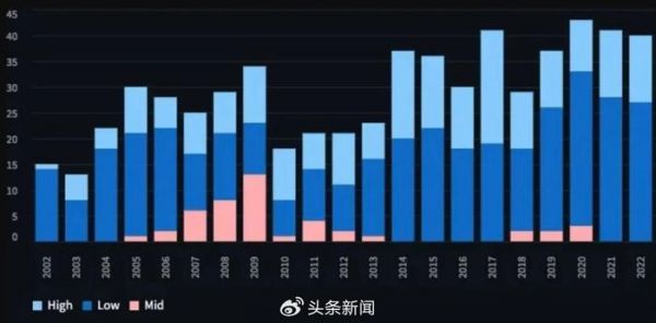 2002-2022年间耐克对SB DUNK高(high)中(Mid)低帮(Low)鞋款的投放数量对比