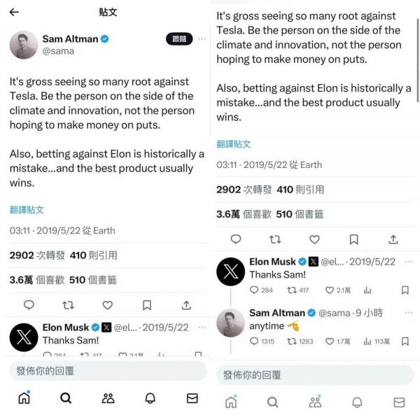 Altman则在X上翻出2019年的一则推文,重评“anytime”并在文字后附一个敬礼的表情符号,暂时“优雅”地回复了马斯克:“看到这么多人反对特斯拉真是令人作呕。应该做一个站在气候和创新这一边的人,而不是一个希望靠看跌期权赚钱的人。
