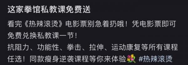 有拳馆直接推出拳击课套餐。也有部分商家给了更加“YOLO”的选择,团购套餐贴上“热辣滚烫”的tag,无论泰拳、私教还是瑜伽,凭观影票根就能换取一张课程优惠券。电影可以只看一次,但健身课必须是要持之以恒的。