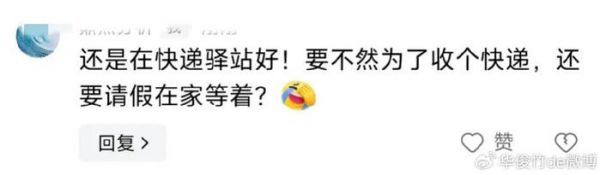 有的客户认为还是用驿站比较好!这样的话大家取快递的时间就比较灵活,下班后、出去买菜随手就把快递拿了!再说在快递站也安全啊!如果自己不在家,快递放门口自己还不放心呢!更有网友调侃:为了收个快递,我还得请假在家等着?