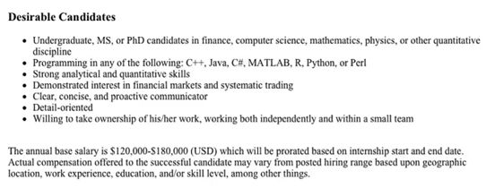而且值得一提的是,这并不是Point72第一次“重金求实习”。早在去年9月,同样是Point72的量化交易板块,Point72曾经为量化研究和开发的暑期实习岗位开出了2.5万美元(约合人民币18万元)的惊人报酬,以至于当时求职圈一片感叹“实习生月薪完胜了我的年薪”。