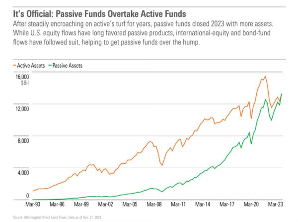 印证上述观点的还有这样一组数据:2023年,在美股一片上涨声中,被动基金的资金管理总体量超过了主动策略。