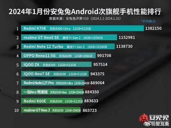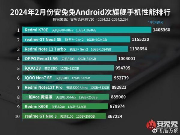 在2024年2月安卓次旗舰手机排行Top10中,排名与机型与上月上榜机型和排名完全相同,排名前三的分别是Redmi K70E(1405360分)、realme GT Neo5 SE(1155230分)、Redmi Note 12 Turbo(1138654分),三款机型分别搭载的是天玑8300-Ultra处理器和骁龙7+Gen2处理器。