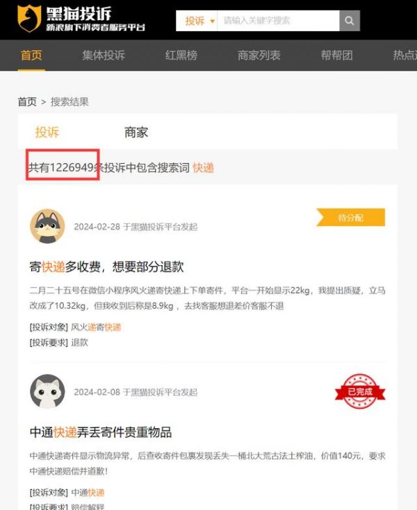 这些现象并不少见,在黑猫投诉平台搜索“快递”,就有超过122万条相关投诉,很多都是投诉快递员擅自将快递存放在驿站或弄丢贵重物品。