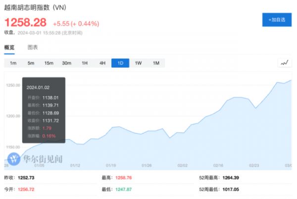 同日,越南基准胡志明指数周三一度上涨1.38%至1254.55,达到2023年9月6日以来的最高点。
