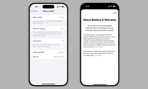 除了帮助用户检视电池健康状态之外,苹果也将充电循环计数视作电池寿命强度的标准,比如iPhone 15系列,苹果最早公开的电池寿命情况为「800次循环仍保持健康状态」。