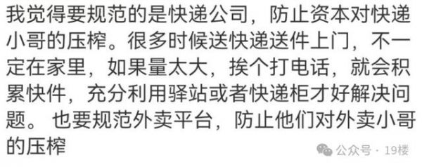 有人认为需要规范和改进的不是快递小哥,而是快递公司。应该多招聘些快递员,而不是一个人干十个人的活儿。