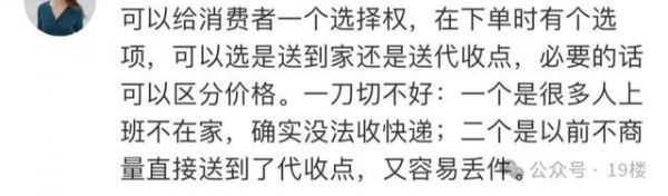 当然,更多网友提出了给消费者自主选择的建议。选择送上门就多加点钱,不加钱的就直接放在驿站,这样既能满足消费者不同的需求,也能保证快递员的收入。