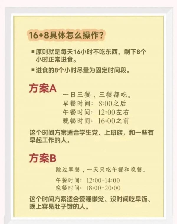 这是一种全新的养生流派,顾名思义,就是在8小时内进食,另外的16小时禁食。