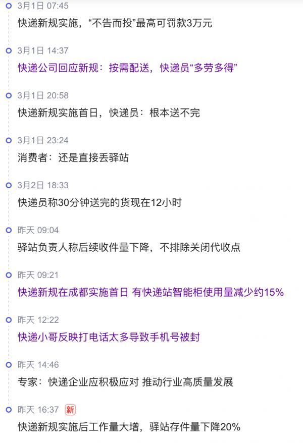 3月1日,《快递市场管理办法》正式施行。其中,第五十四条“未经用户同意,代为确认收到快件,擅自使用智能快件箱、快递服务站投递快件,抛扔踩踏快件的,将根据情节严重程度,可能给予最高3万元罚款”的规定,踩中了行业长期以来的痛点,引发了社会各方的广泛关注。