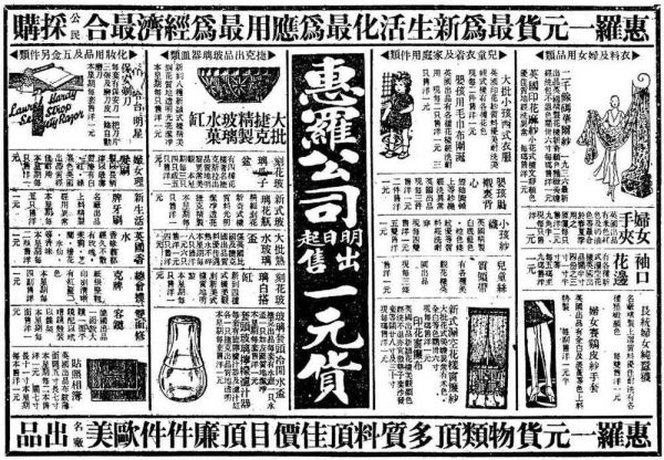 例如当时惠罗公司的典型广告,篇幅占去《申报》的全版页面,促销手帕、蕾丝、雨衣、鞋靴、熨斗、钟表、热水瓶等各式商品,不一而足。