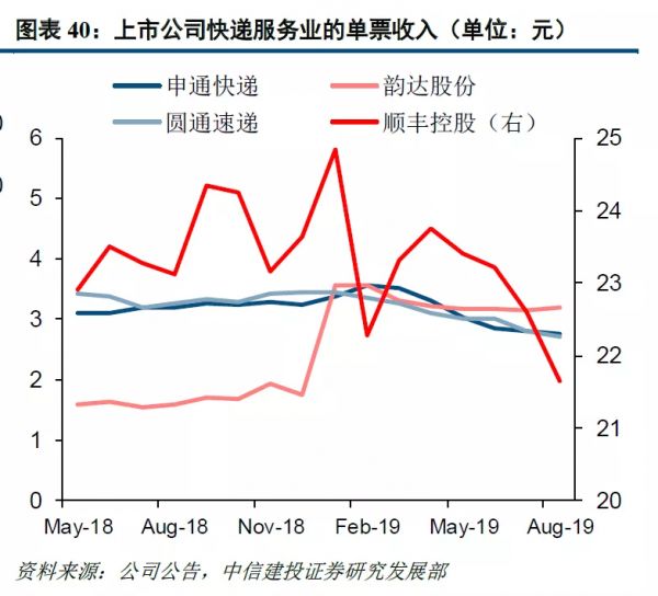 近日,A股四大快递公司顺丰、圆通、申通和韵达相继发布了2019年8月经营简报。据中信建投统计,8月规模以上快递票均单价为11.63元,同比下降2.36%。分公司看,顺丰8月份单票收入减少至21.65元,同比下降6.36%;申通、韵达、圆通单票收入分别为2.76元、3.20元、2.72元。
