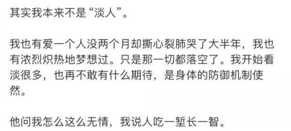 才逐渐变得对一切人、事、物的态度都淡淡的,任凭别人说自己寡淡、淡漠、漠然,“寡人”们不在乎,自己的舒心和由内向外的掌控是第一位的。