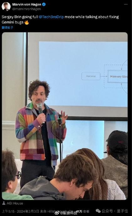 【#谷歌创始人现身AI黑客聚会#,分享修复Gemini大模型bug的话题】#谷歌创始人回应大模型无法生成白人# 谷歌传奇创始人,千亿美元身价的布林,周末现身 AI 黑客马拉松现场。他像“科技宅”一样,现场分享了关于修复 Gemini 大模型 bug 的问题,一下子引起热议。在将近 40 分钟的演讲中,布林谈到了 Gemini 开发内幕、AGI、AI 对社会影响的看法等,还诚实地回答了大家的许多问题。有在现场的谷歌前研究科学家晒出合影,并表示非常受启发。