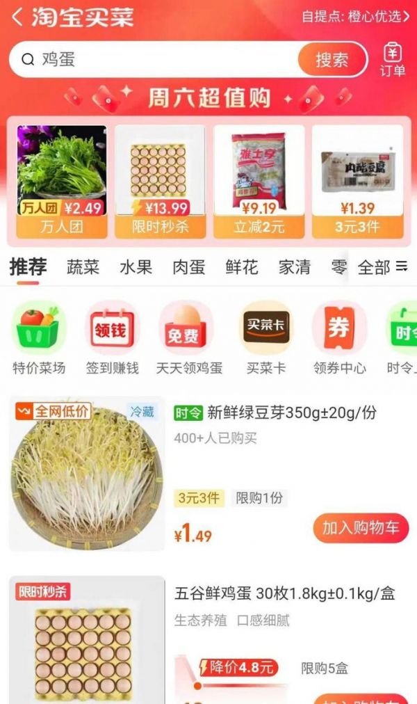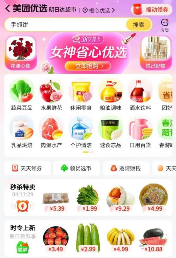 目前,在美团买菜和美团优选中,能看到休闲零食、日用清洁、个护美妆、酒水饮料等多种非生鲜品类。