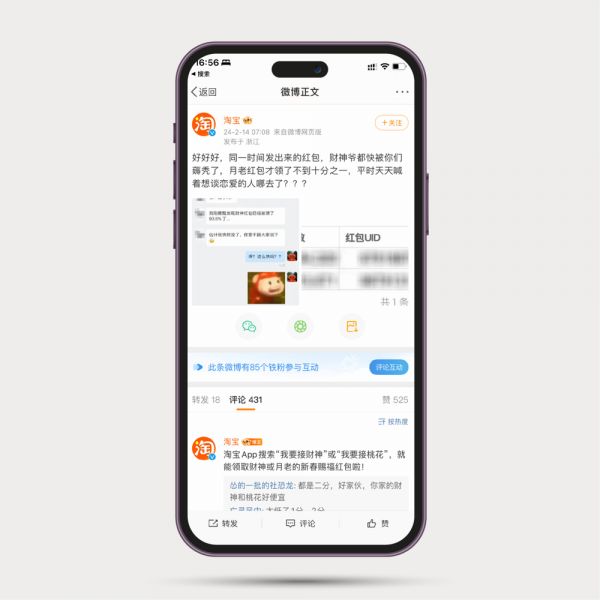 2024 年的情人节恰逢正月初五 “接财神”的日子,淘宝官方微博在当天分别发放了 “财神红包” 和 “月老红包” 供用户领取。相关数据显示,截至上午 7 点左右,财神红包领取进度为 93.5%,而月老红包领取进度仅为 5.8%。