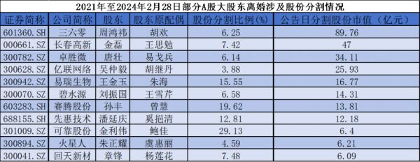 从分割股份市值排名来看,三六零(601360.SH)实际控制人周鸿祎因离婚被分割的股份对应的市值位居首位。