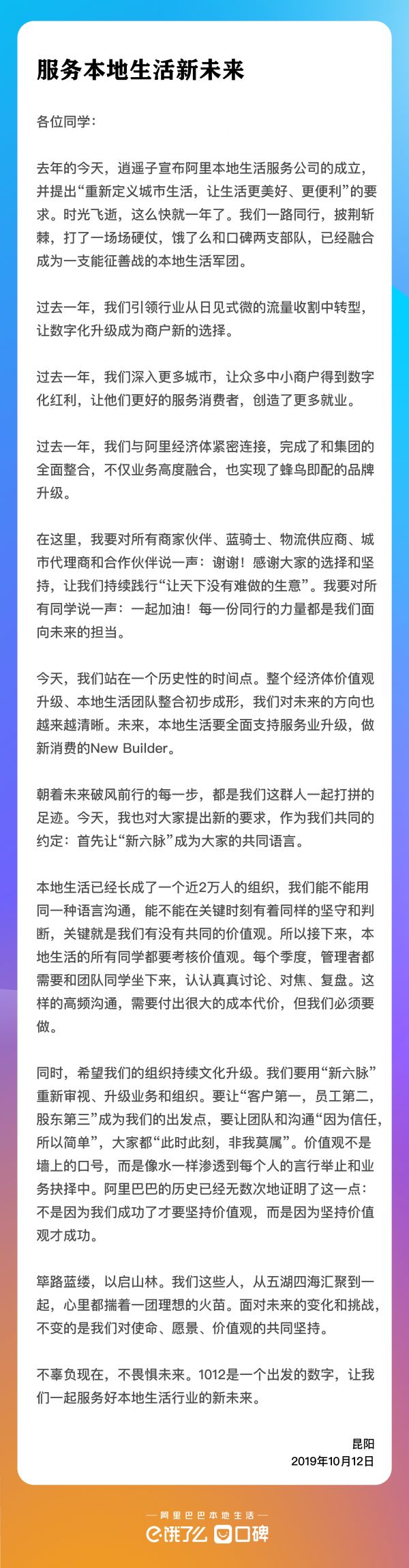 以下为阿里本地生活服务公司总裁王磊致员工信全文: