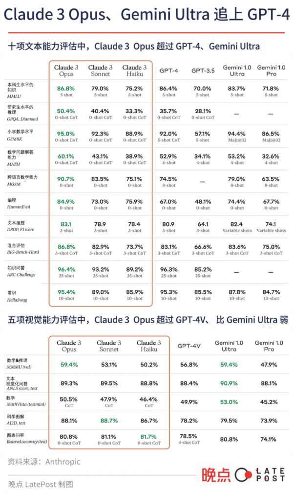 Anthropic 列出的十项常用模型能力评估数据集表明,Opus 得分全都超过 GPT-4,视觉识别能力评估数据集上的情况也一样。