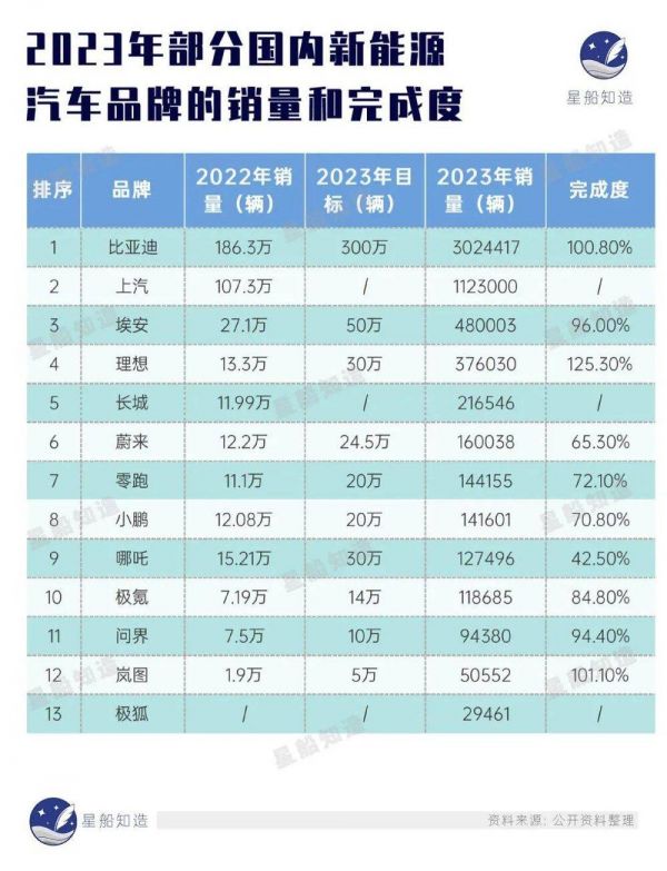 车企的价格战相关信息已经很多了,我们就不再重复写了。梳理了过去一年部分国内新能源汽车品牌的销量和完成度情况,见下图: