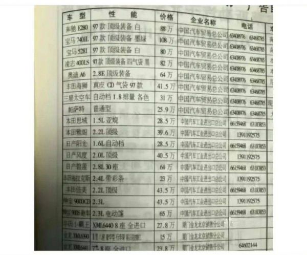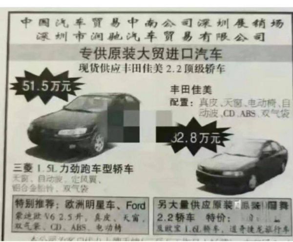 下图是两张二十多年前的汽车价目广告。三菱1.5L轿车售价超过50万。2.2L本田雅阁售价接近40万。1996年我国城镇职工的平均月薪是五百多元。