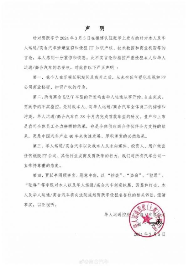 他通过一纸诉状将丁磊和他身后的高合汽车告上法院,称丁磊窃取FF知识产权、技术数据和商业机密等,意图在高合病危中“要它的命”。但很快,丁磊否认了指控。