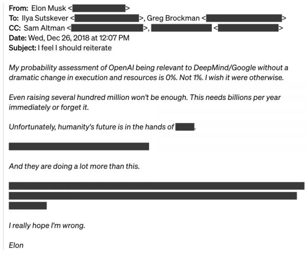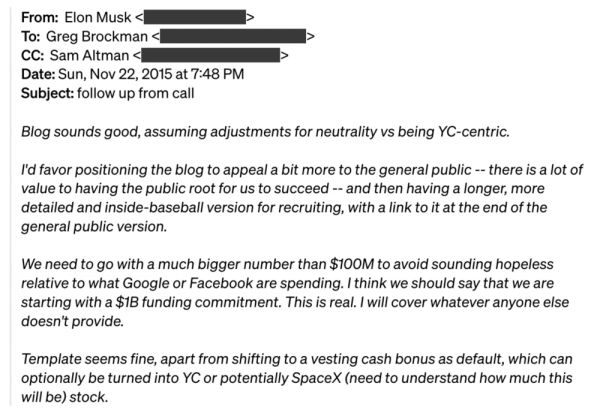 2015 年底创办 OpenAI 时,格雷格(Greg Brockman)和萨姆(Sam Altman)最初计划筹集 1 亿美元。埃隆在一封电子邮件中说“我们需要一个比 1 亿美元大得多的数字,以免听起来毫无希望......我认为我们应该说,我们从 10 亿美元的资金承诺开始......其他人不提供的,我都会承担。”