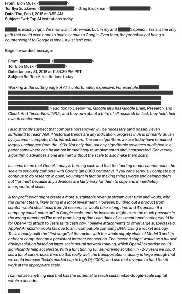 我们无法就营利性公司的条款与埃隆达成一致,因为我们认为任何个人对 OpenAI 拥有绝对控制权都有悖于公司使命。于是,他建议将 OpenAI 并入特斯拉。2018 年 2 月初,埃隆给我们转发了一封邮件,建议 OpenAI “依附于特斯拉,作为自己的摇钱树”,并评论说 “完全正确......特斯拉是唯一一条甚至有望与谷歌相提并论的道路。即便如此,与谷歌抗衡的可能性也很小。但并不是零”。